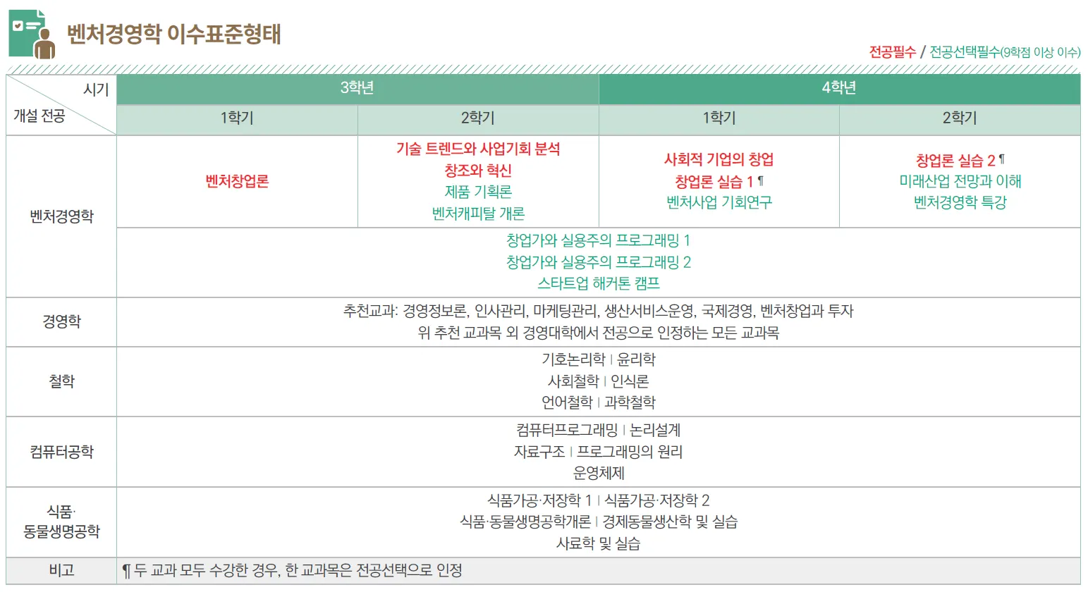 전공필수 | M1338.000200 | 벤처창업론 | 창업의 A부터 Z까지 다루는 과목입니다. 아이디어 발굴, 사업계획서 작성, 자금조달 전략까지 체계적으로 학습하며 창업가적 마인드셋을 형성합니다. |