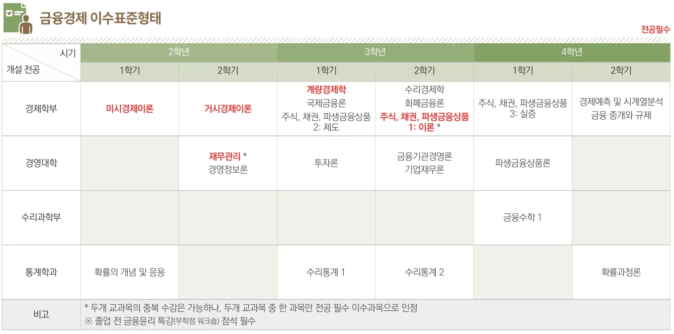 금융경제 연계전공은 수리·통계학적 기초 역량을 바탕으로 경제학과 금융에 대한 이론적 이해를 결합한 정량 분석 능력을 요구한다. 특히 통계학과 수리과학을 기반으로 한 분석 도구에 대한 이해와 이를 실무적으로 적용할 수 있는 사고력이 중요하며 고등학교 단계에서는 수학과 사회 교과목에 대한 기초 학습이 필요하다. 대학에서는 경제학부, 경영학과, 통계학과, 수리과학부 등에서 개설된 기초 과목을 이수함으로써 통합적 시각을 갖출 수 있도록 교육과정이 구성되어 있다.