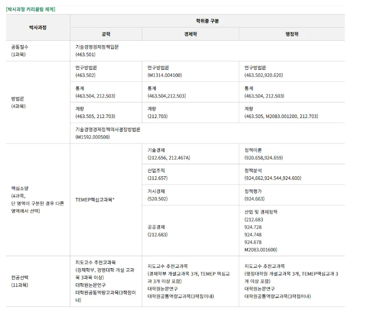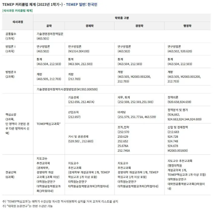 아울러 기술경영경제정책의 주요 관심사 중 하나인 ‘기술과 제도’, ‘산업구조와 경쟁전략’, ‘공공정책의 효과 분석’ 등을 쉽게 이해하기 위해서는 산업조직론, 정책학의 이해 등 사회과학 기반 과목을 수강하는 것도 권장된다. 이러한 기초 역량은 TEMEP의 다학제적 과목을 보다 빠르게 소화하고, 이후의 연구 및 실무 적용에서도 중요한 기반이 된다.