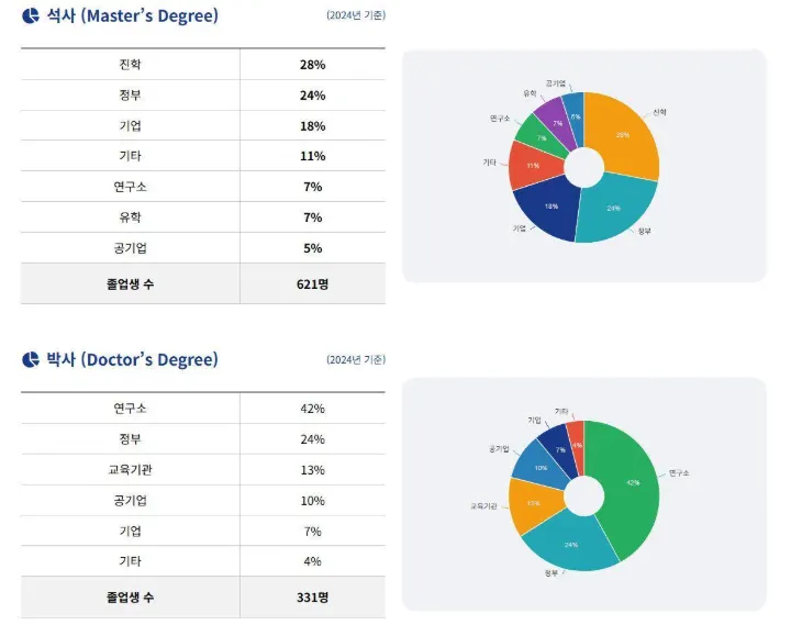 2024년 기준 석사 졸업생 621명 중 약 70%가 진학(28%) 정부기관(24%), 기업(18%) 등 사회 각 분야의 핵심 경로로 진출했으며, 특히 대기업, 전략 컨설팅, 정책기관 등 전공의 융합적 역량을 잘 활용할 수 있는 곳으로 취업한 사례가 돋보인다.