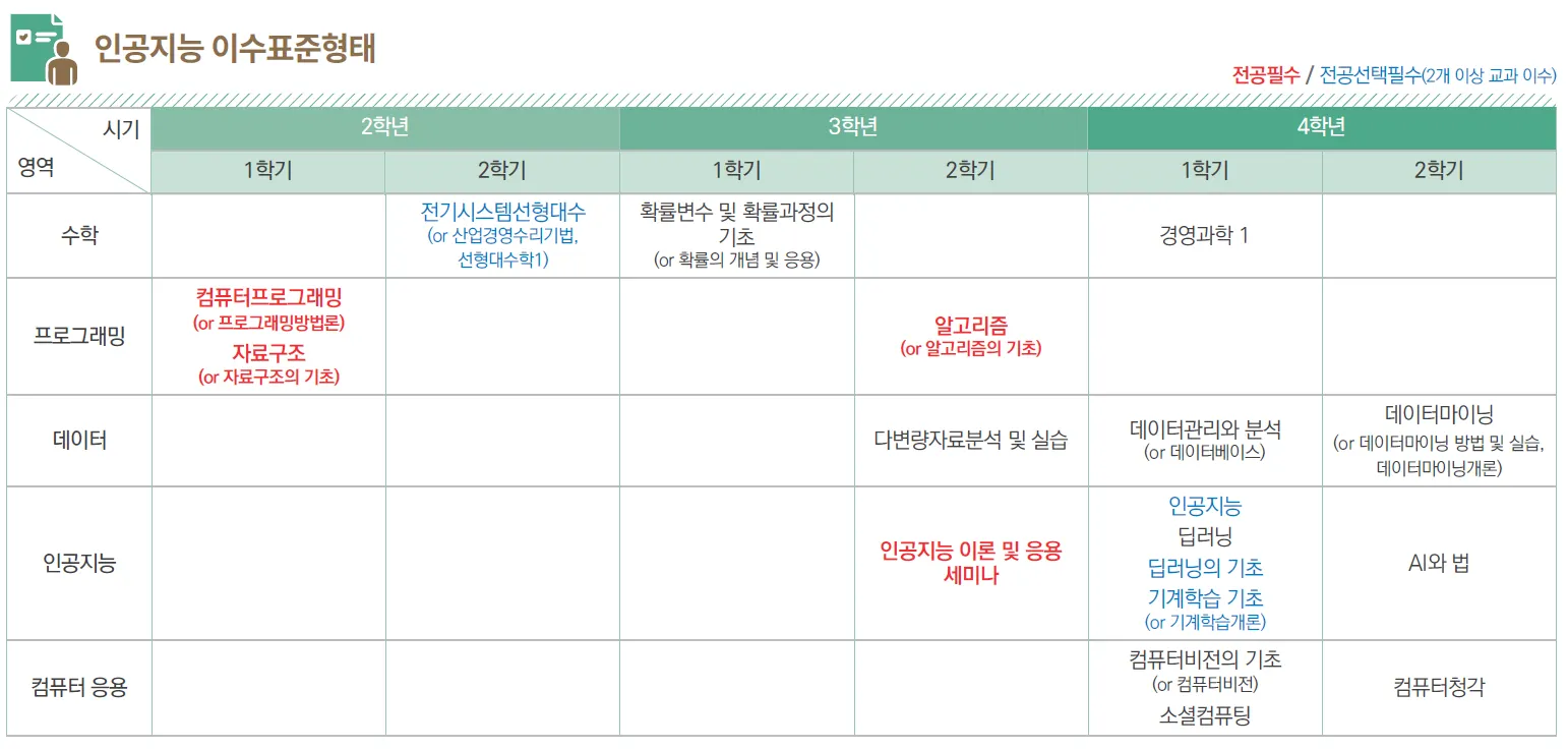 수학적 기초: 기계학습과 딥러닝 등의 이해를 위해 선형대수, 확률 및 통계, 미적분 등의 수학적 기초가 중요합니다. 관련 교과목으로는 ‘확률의 개념 및 응용’, ‘확률변수 및 확률과정의 기초’ 등이 있습니다.